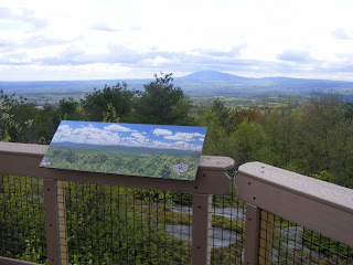 Gregg Trail is wide, with an average 5% grade. Bring the whole family and take your time along the way. There are blueberry bushes all over the place, which of course did me no good today but should be perfect in July. Along the way, look east to the twin Uncanoonuc Mountains in Goffstown and the whaleback-shaped Joe English Hill in New Boston. As you approach the knoll, you'll see North Pack Monadnock and Pack Monadnock to the south. Finally, as Monadnock comes into view, you'll see all kinds of hills that will make you wonder what's what - and fortunately, there's an illustration nearby that names each peak.
